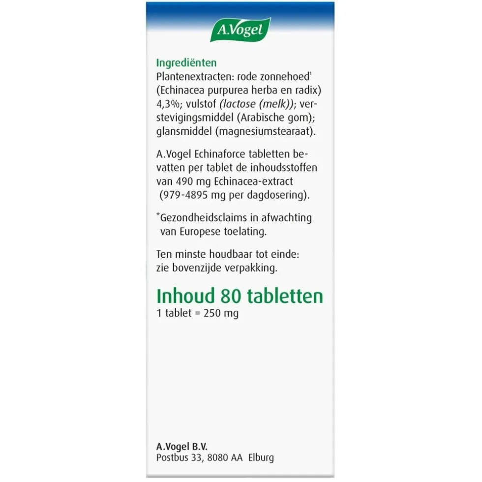 Samenstelling: A.Vogel Echinaforce tabletten bevatten per tablet de inhoudsstoffen van 490 mg Echinacea-extract (979-4895 mg per dagdosering).