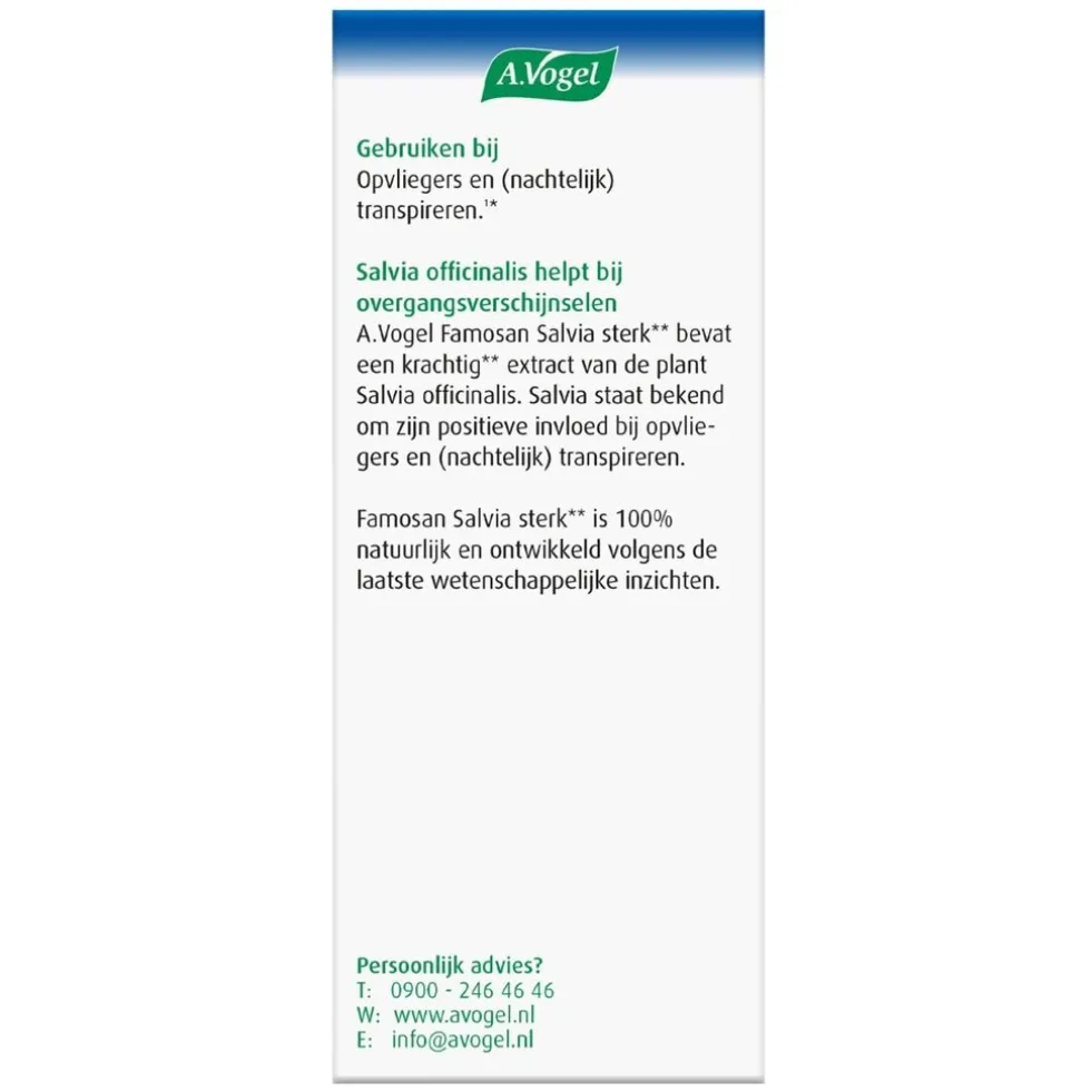 Opvliegers? Nachtzweten? A.Vogel Overgang Famosan Salvia Sterk** Tabletten bevatten een krachtige** formule. Salvia helpt vrouwen in de overgang bij opvliegers, zweten en nachtelijk transpireren*.