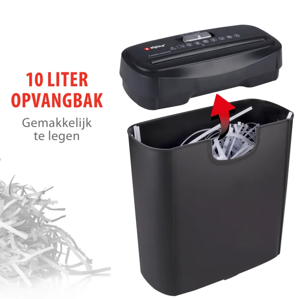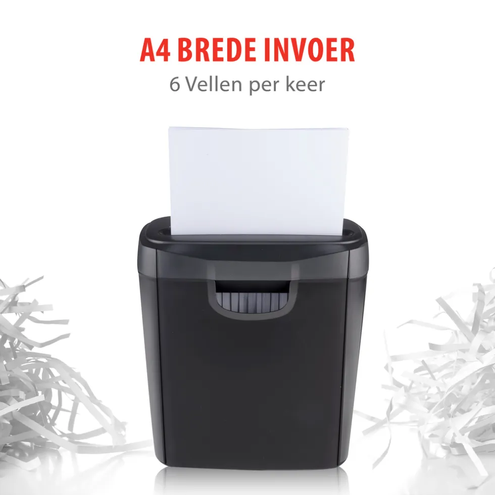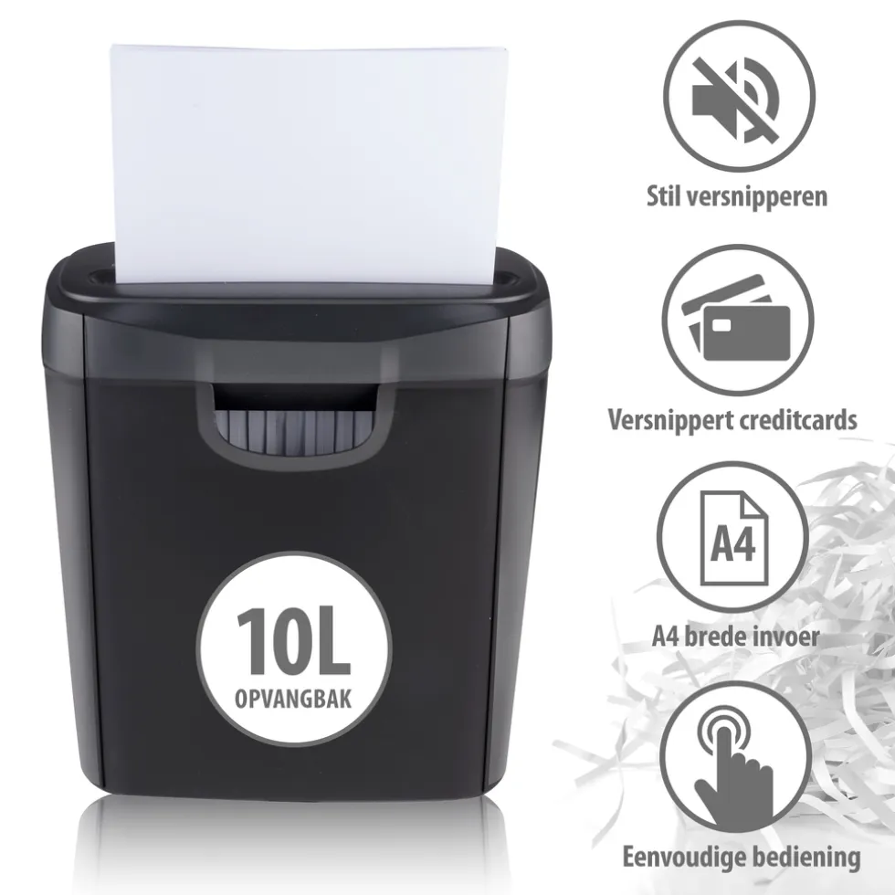 Versnipperaar voor papier: 6 A4 vellen per keer De automatische shredder versnijdt je papier in stroken. De snijstrip snijdt per keer 6 vellen van 80 gram A4-formaat. De kleine papierstrookjes vangt hij op onder de messen, in een opvangbak van 10 liter.Gemakkelijk bedienenBedienen van de shredder gaat heel gemakkelijk. Bovenop de papierversnipperaar zit een bedieningsknop met 4 standen: