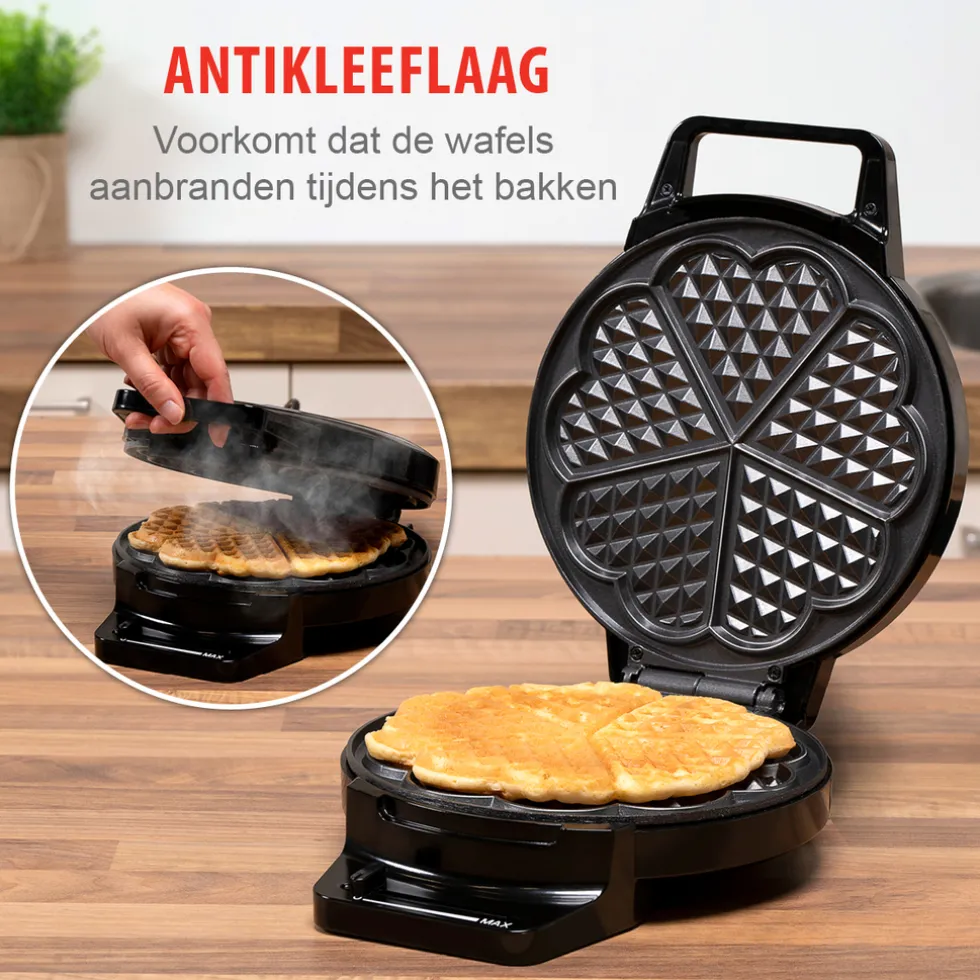 Nadat je het wafelijzer voor de eerste keer hebt schoongemaakt, steek je de stekker in het stopcontact en zet je het apparaat aan door knop tot MAX-stand open te draaien. De wafelmaker zal voorverwarmen en geeft aan doormiddel van een groen lichtje wanneer het klaar is voor gebruik. Schenk het beslag in het wafelijzer en sluit de deksel voorzichtig om morsen te voorkomen. In 3-5 minuten zijn de wafels klaar, waarna het indicatielampje zal gaan branden. Eet smakelijk!