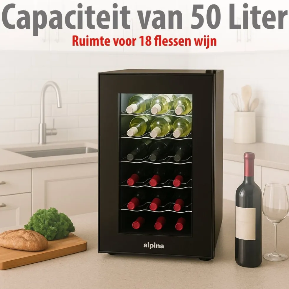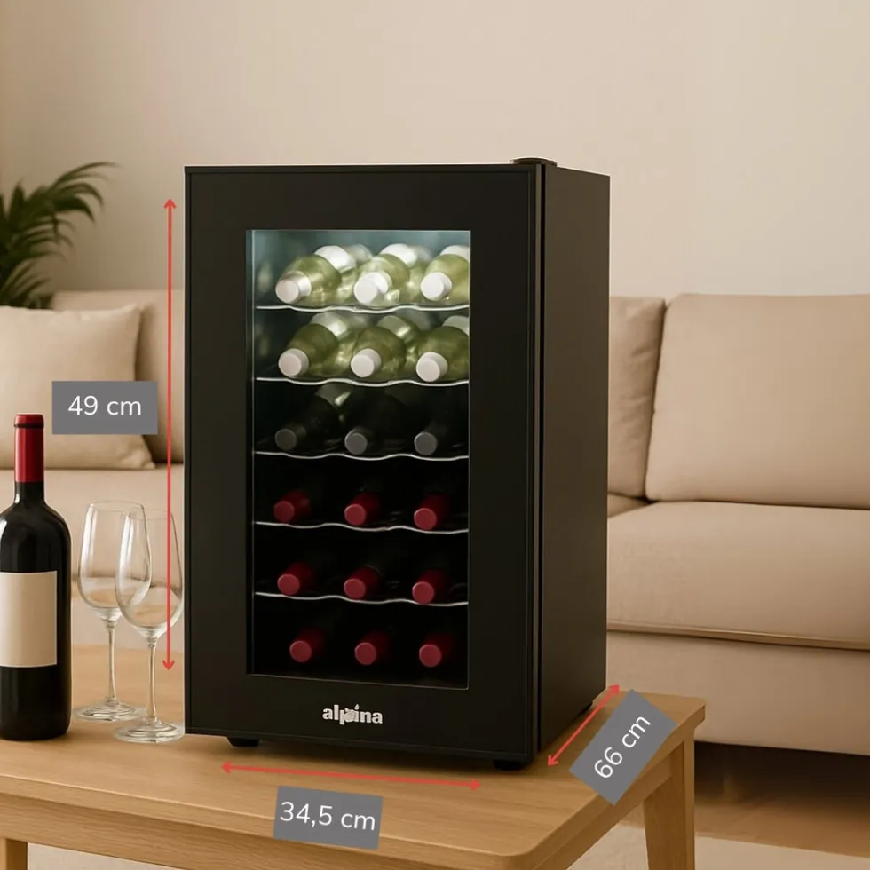 De wijnkoelkast van alpina biedt ruimte voor 18 wijnflessen verdeeld over 5 rekken en de bodem van de wijnkast. Op elk wijnrek is er ruimte voor 3 flessen om horizontaal te liggen. Het is belangrijk dat je wijnflessen op deze manier kunt bewaren omdat je zo voorkomt dat de kurk van een wijnfles uitdroogt. Wanneer dat gebeurd kan er namelijk zuurstof bij de wijn komen en zal deze sneller vergaan en ondrinkbaar worden.