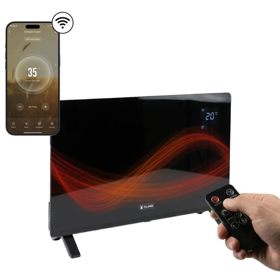 De BluMill Elektrische Kachel is een duurzaam alternatief voor traditionele verwarming en combineert efficiëntie met een modern uiterlijk. Dankzij het compacte formaat en het minimalistische zwarte glas design past de design kachel moeiteloos in elk interieur. De kachel neemt weinig ruimte in beslag en kan zowel vrijstaand op de vloer als aan de muur worden gemonteerd. Alle benodigde onderdelen worden standaard meegeleverd. Bedien je elektrische kachel eenvoudig met de app, ingebouwde LCD touchscreen of meegeleverde afstandsbediening! De ingebouwde thermostaat zorgt ervoor dat de kachel automatisch stopt met verwarmen zodra de ingestelde temperatuur is bereikt, wat zorgt voor een constant comfort en efficiënt energiegebruik.