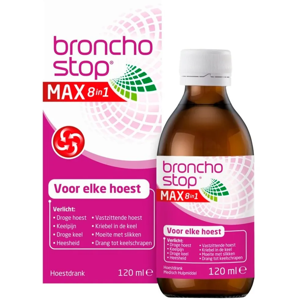 Bronchostop Max 8-in-1 Hoestdrank zorgt voor een snelle verlichting van elke hoest, bij verkoudheid. Bronchostop is bedoeld voor de snelle verlichting van elke hoest (droge en vastzittende) tijdens een verkoudheid, keelpijn als gevolg van verkoudheid, bijbehorende heesheid, drang tot keelschrapen en kriebel in de keel, droogheid van je mond en keel.