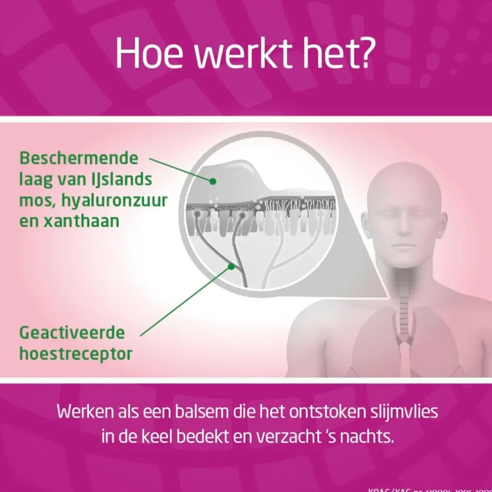 Suikervrij;Claimbeschrijving|Voor elke hoest, verlicht: – Droge hoest- Keelpijn- Droge keel- Heesheid- Vastzittende hoest- Kriebel in de keel- Moeite met slikken- Drang tot keelschrapen