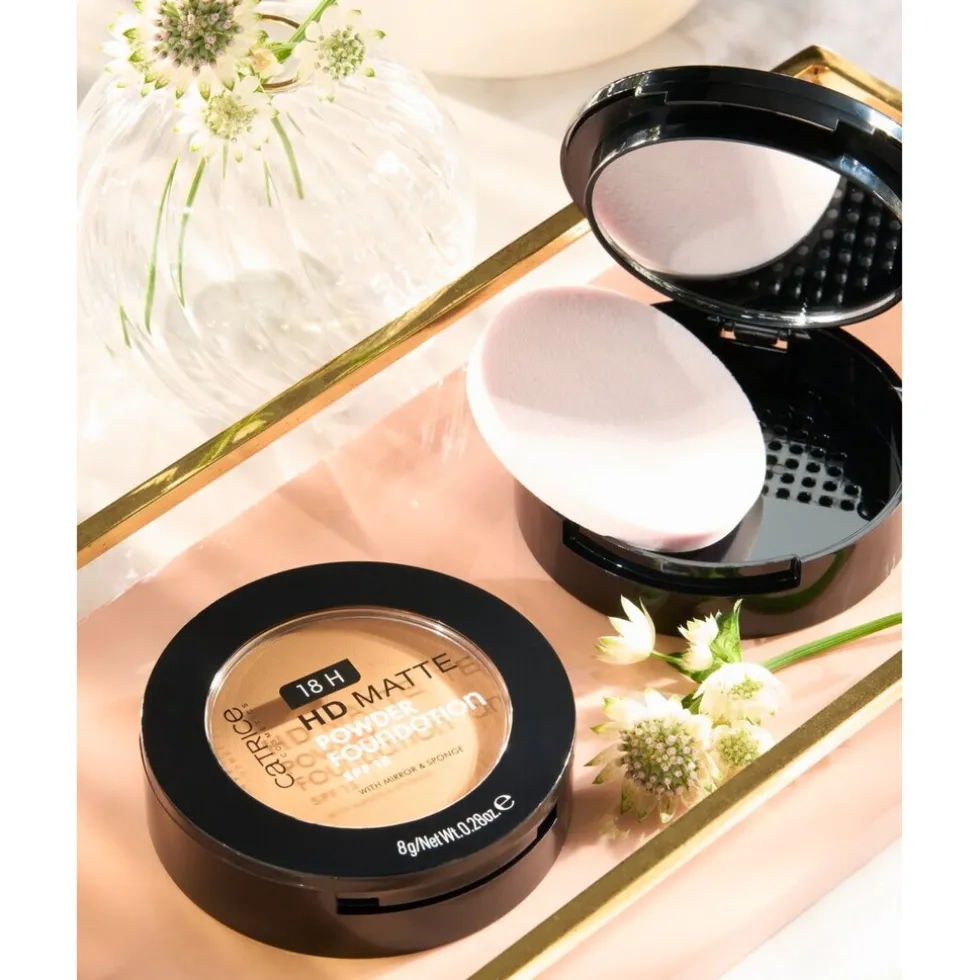 Dag glimmende huid! De Catrice 18H HD Matte 030W Powder Foundation biedt de dekking van een vloeibare foundation met de matterende finish van een poeder.