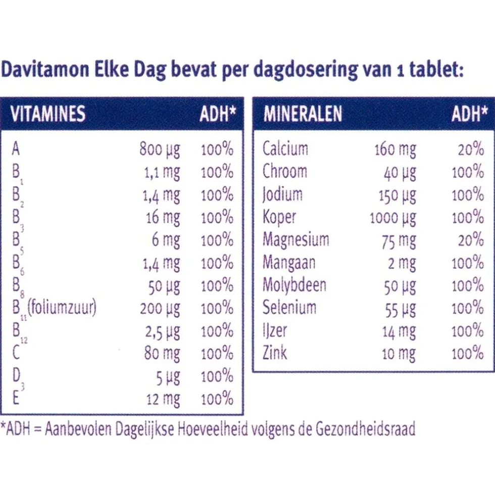 Samenstelling:# Davitamon Elke Dag bevat per dagdosering van 1 tablet:# Vitamines;RI*#A;800;µg;100%#B1;1,1;mg;100%#B2;1,4;mg;100%#B3;16;mg;100%# B5;6;mg;100%#B6;1,4;mg;100%#B8;50;µg;100%#B11 (foliumzuur);200;µg;100%#B12;2,5;µg;100%#C;80;mg;100%#D3 (cholecalciferol);5;µg;100%#E;12;mg;100%#Mineralen;RI*#calcium;160;mg;20%#chroom;40;µg;100%#jodium;150;µg;100%#koper;1;mg;100%#magnesium;75;mg;20%#mangaan;2;mg;100%#molybdeen;50;µg;100%#selenium;55;µg;100%#ijzer;14;mg;100%#zink;10;mg;100%#