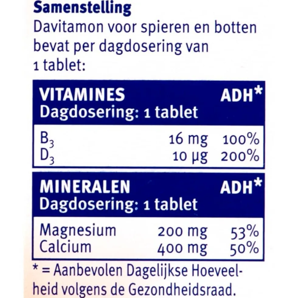 Samenstelling:# Davitamon Magnesium – Spieren en botten bevat per dagdosering van 1 tablet:# Vitamines;RI*# B3;16;mg;100%# D3 (cholecalciferol);10;µg;200%#Mineralen;RI*#calcium;400;mg;50%#magnesium;200;mg;53%#