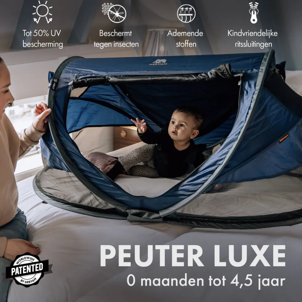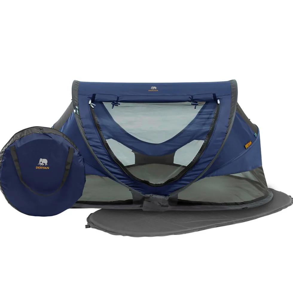 De DERYAN Peuter Luxe is dé ideale oplossing én vervanging van het zware campingbedje. Laat je niets meer in de weg staan met deze compacte, lichtgewicht & pop-up reistent. De DERYAN Peuter Luxe biedt ultieme bescherming tegen zon, muggen en andere insecten. Met zijn 2,4 kg neem je ‘m in een handomdraai mee naar ouders, familie, vrienden, vakantie of zelfs de wereldreis van je dromen!