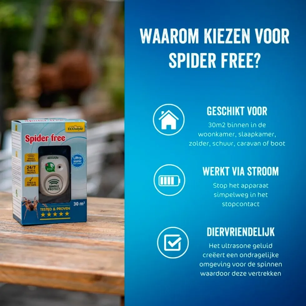 Ecostyle Spider Free zendt het unieke Single Protect ultrasone geluid uit, een variërend en specifiek aangepast ultrasoon geluid dat spinnen verjaagt.
