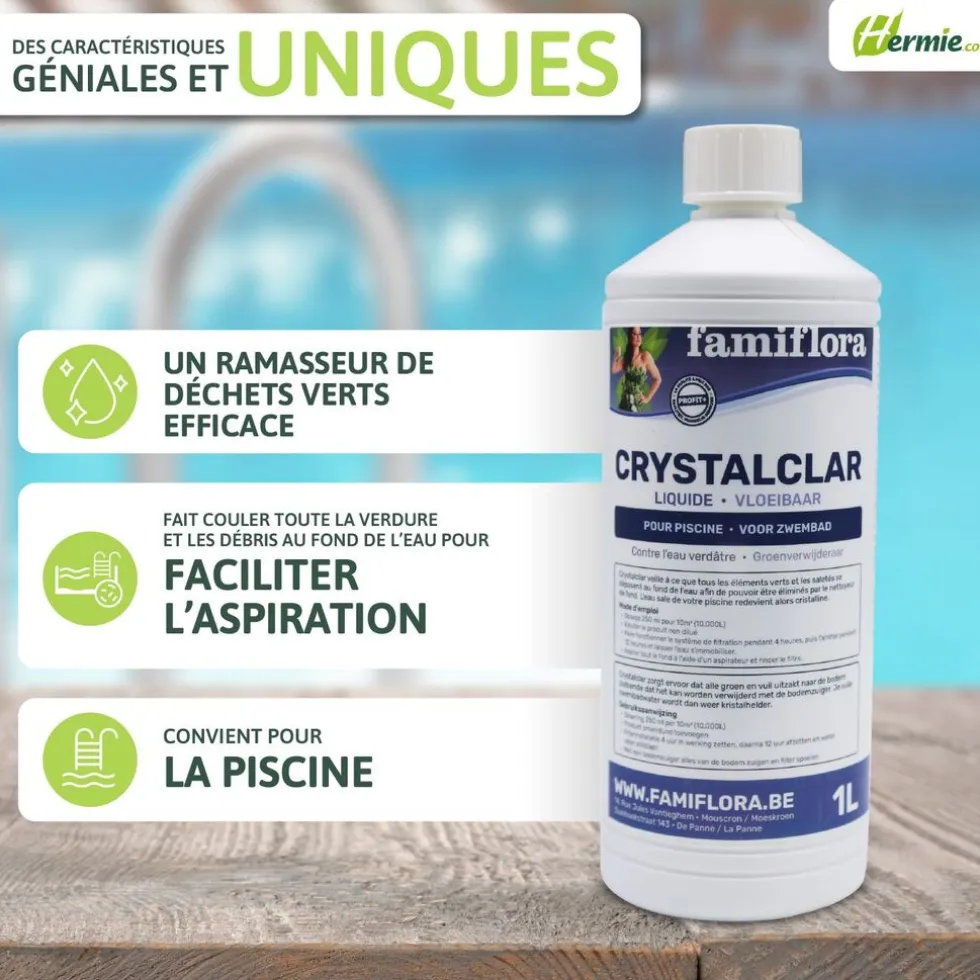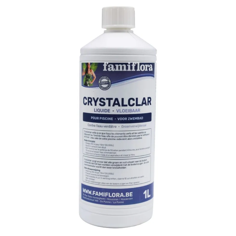 Crystalclar zorgt ervoor dat alle groen & vuil uitzakt naar de bodem zodat het makkelijk opgezogen kan worden door de bodemzuiger. Zo wordt het vuile zwembadwater opnieuw kristalhelder!Dosis: