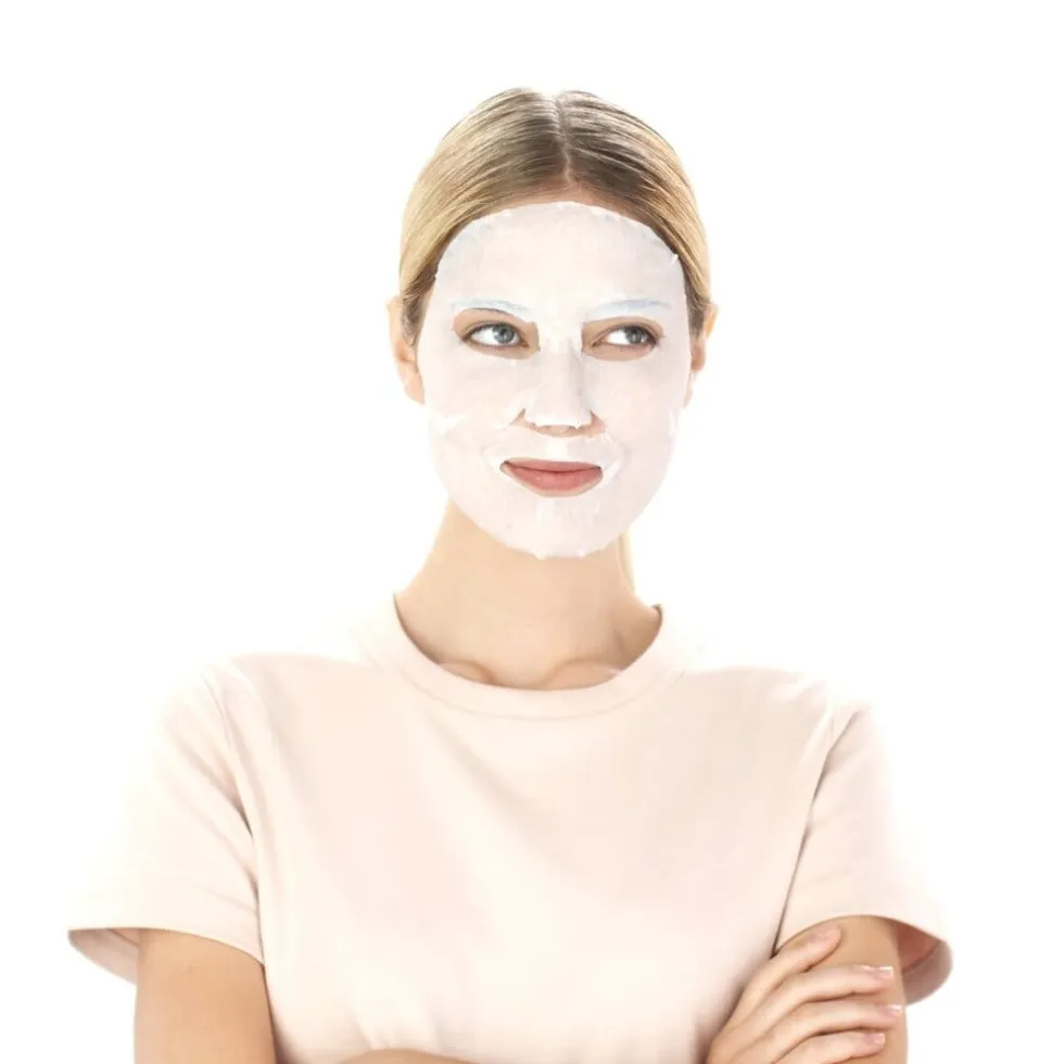 Stap 1: Aanbrengen. Vouw het masker open. Breng het aan op een schoon gezicht met de witte kant van het masker naar het gezicht toe. De blauwe beschermlaag moet zichtbaar zijn op het gezicht.