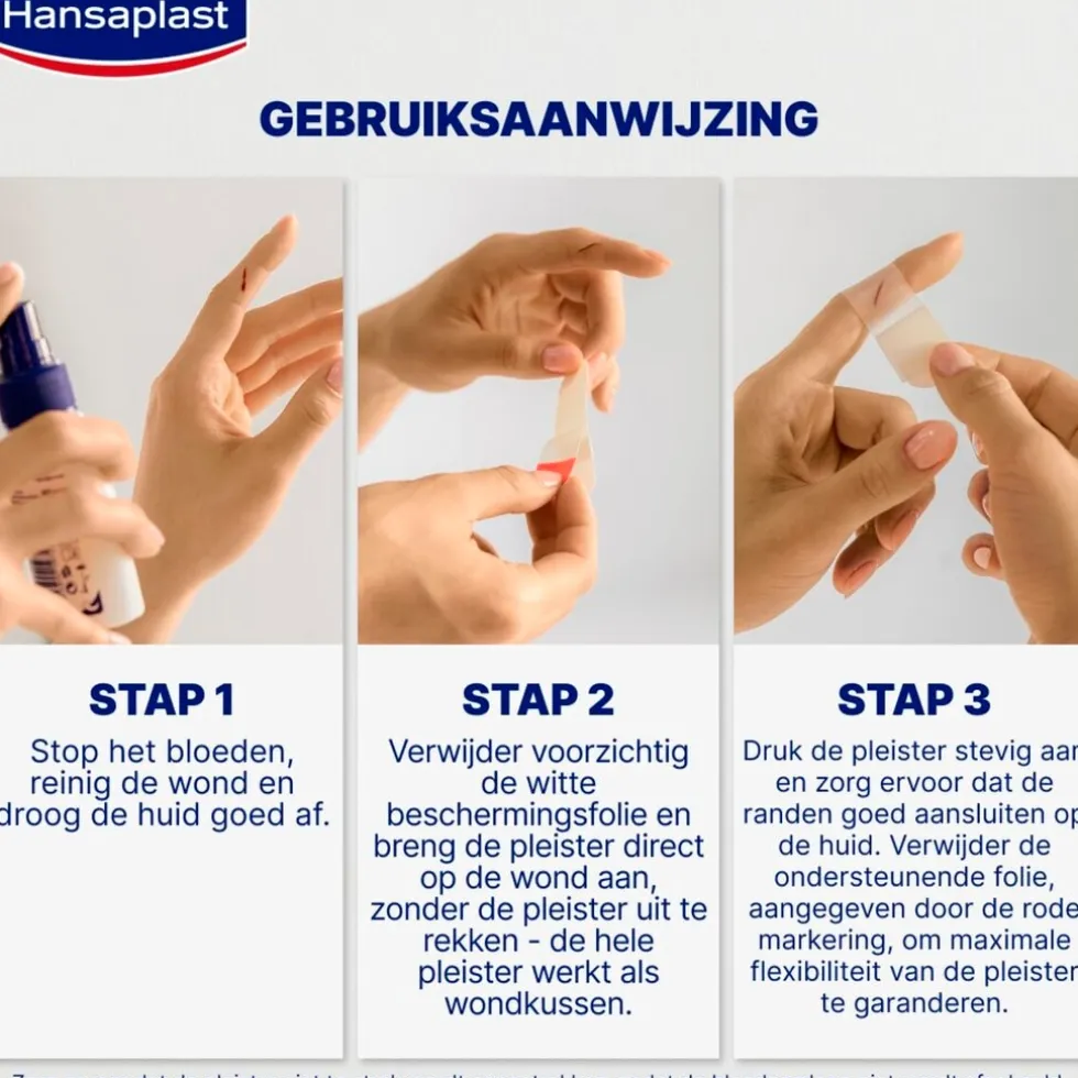 Lees voor gebruik de bijsluiter. Diabetici en mensen met een slechte bloedsomloop moeten voor gebruik een arts raadplegen. Stop het bloeden en reinig de wond grondig voordat je de pleister aanbrengt. De pleister is ontworpen om te blijven zitten totdat het begint los te komen.