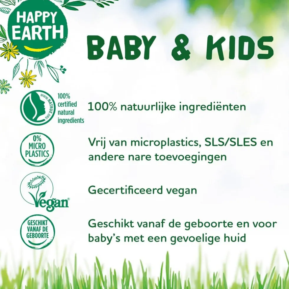 Happy Earth Baby & Kids Wash & Bath Gel is gecertificeerd vegan en microplasticvrij. De verpakking is een fles van 100% gerecycled plastic.