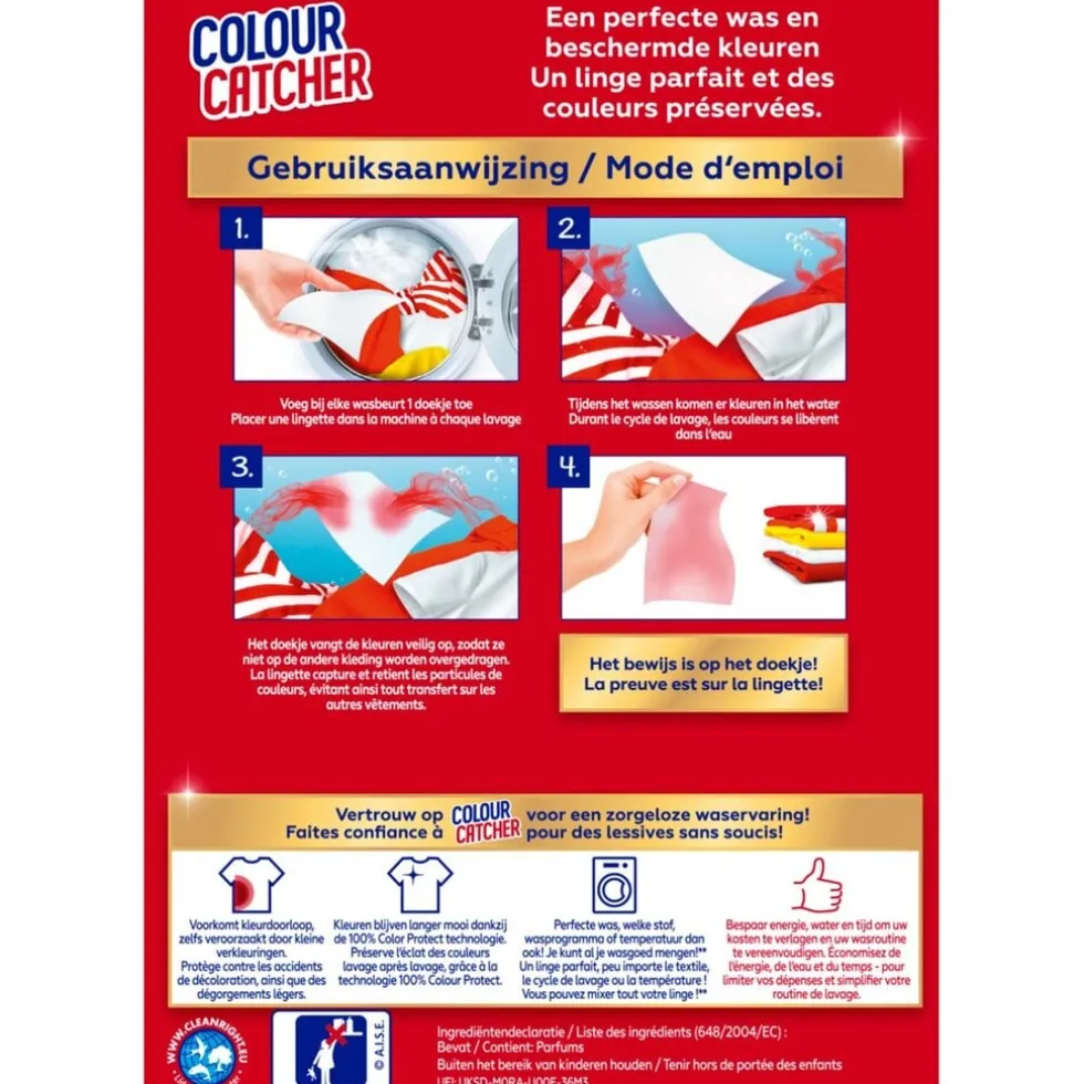 Voorzorgsmaatregelen: Bepaalde textielsoorten zijn gevoeliger voor kleurdoorloop: donkergekleurde stoffen, katoen en niet-kleurvaste kledingstukken. We adviseren u om in gevallen waar grote hoeveelheden kleurstof vrijkomen meerdere doekjes te gebruiken. Zorg bij gemengd wassen voor een goede verhouding van gekleurd en wit wasgoed. Nieuwe gekleurde kledingstukken moeten tenminste 6 keer apart gewassen worden. Beddengoed, handdoeken en jeans moeten altijd apart gewassen worden. Effectiviteit kan niet worden gegarandeerd wanneer grote hoeveelheden kleurstof vrijkomen van niet-kleurvaste kledingstukken. Houdt u aan de instructies van de wasmachinefabrikant. Buiten het bereik van kinderen houden.
