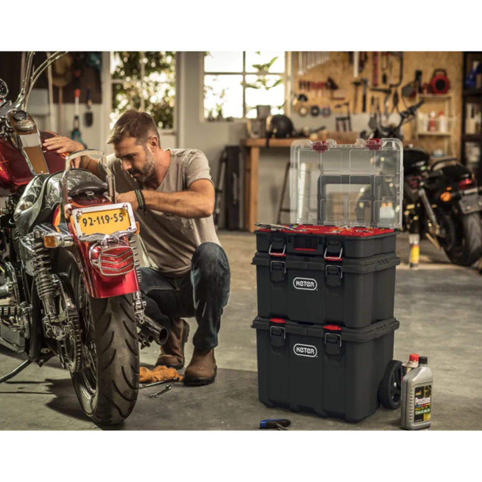 De Keter Stack & Roll gereedschapswagen is de perfecte oplossing voor het opbergen en verplaatsen van gereedschap en accessoires. Ideaal voor DIY-liefhebbers, hobbyisten en professionals. De Stack & Roll gereedschapskar bestaat uit een 3-delig systeem: een gereedschapswagen, een losse gereedschapskist en een opbergdoos voor accessoires. Dankzij het lichte gewicht, een indrukwekkend draagvermogen van 45 kg en de stapelbare, modulaire connectiviteit biedt de gereedschapskar flexibiliteit voor de meest uiteenlopende klussen.