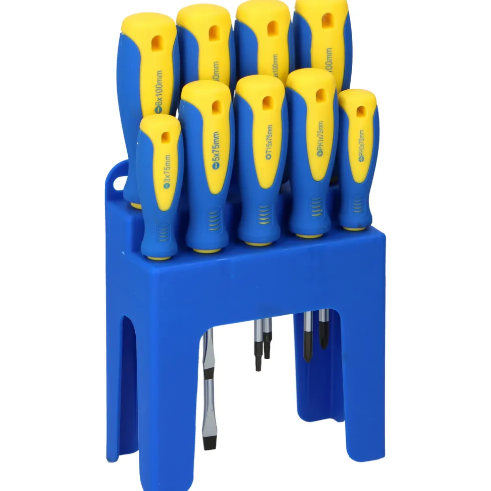 De handige bijgeleverde houder zet je makkelijk neer of monteer je hangend aan de muur. Zo houd je de schroevendraaiers mooi en overzichtelijk bij elkaar.
