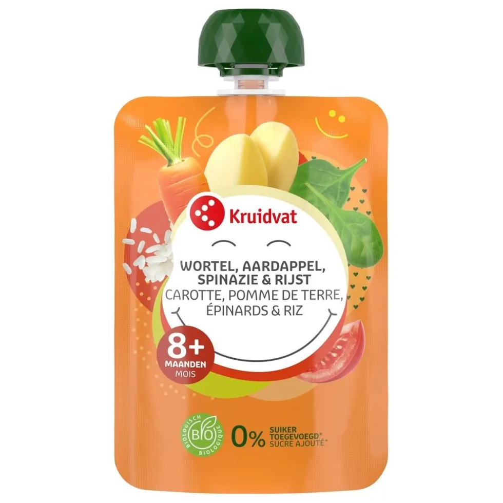 Het Kruidvat 8+M Bio Wortel, Aardappel, Spinazie & Rijst Knijpzakje is biologische babyvoeding van wortel, aardappel, spinazie, rijst en tomaat in een handig knijpzakje. Er is 0% suiker toegevoegd*.