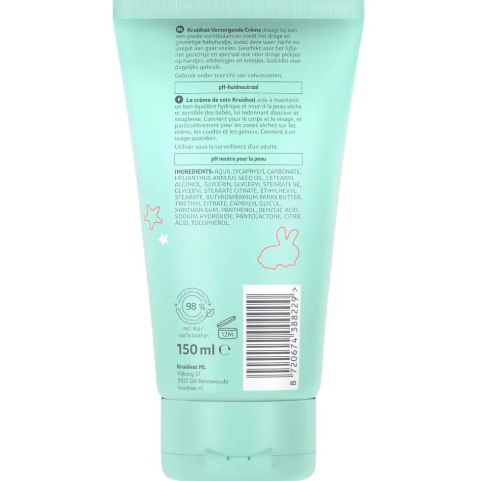 De Kruidvat Baby Verzorgende Crème draagt bij aan een goede vochtbalans en voedt het droge en gevoelige babyhuidje, zodat deze weer zacht en soepel aanvoelt.