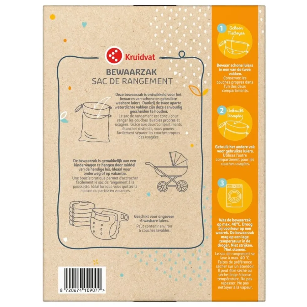 Deze schattige Kruidvat Bewaarzak voor Wasbare luiers met Berenprint is ontwikkeld voor het bewaren van schone en gebruikte wasbare luiers. Dankzij de twee aparte waterdichte vakken houd je deze eenvoudig gescheiden.