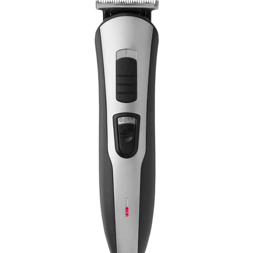 De Kruidvat Professional Multigroomkit is een oplaadbare scheerset met neus- en detailtrimmer en baard- en haartondeuse.