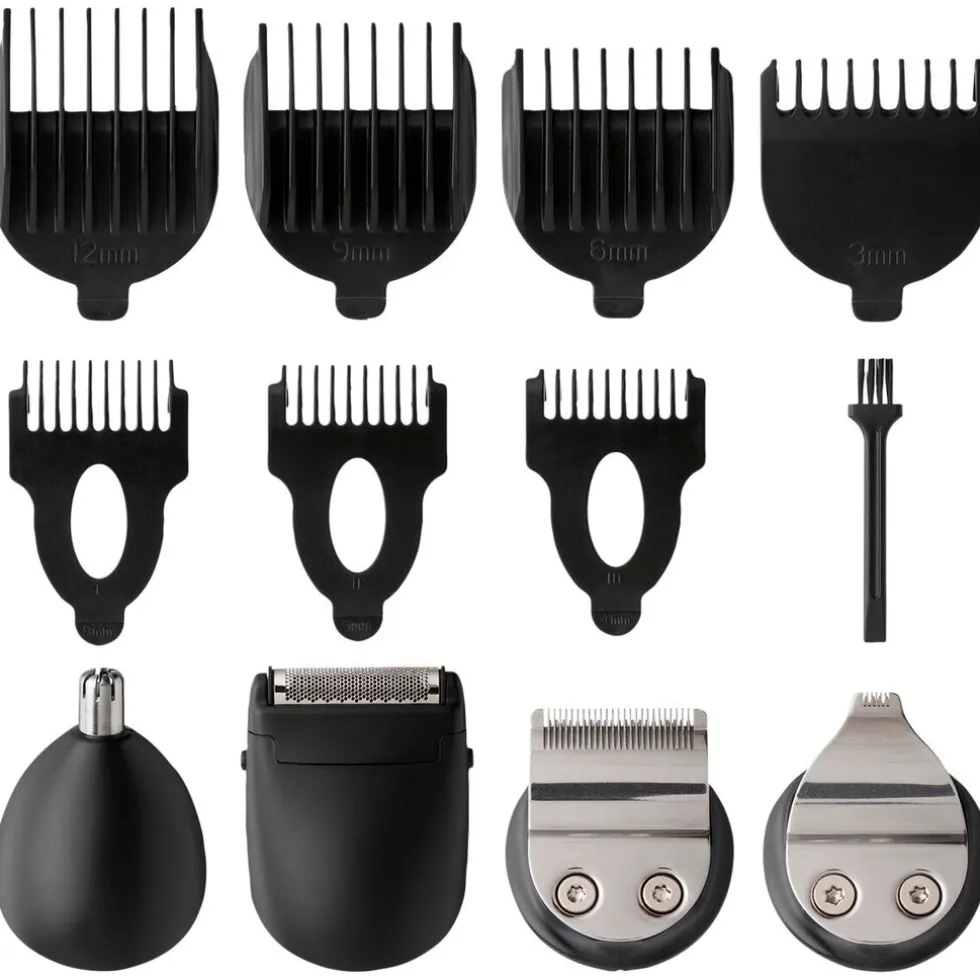 De scheerkit bevat twee afneembare uitdunopzetstukken voor de tondeuse, een verstelbaar opzetstuk voor bakkebaarden en drie afneembare opzetstukken voor het lichaamshaarscheerapparaat. De 5-in-1 set wordt geleverd met borsteltje, olie en lader. Het apparaat is in 12 uur volledig opgeladen.