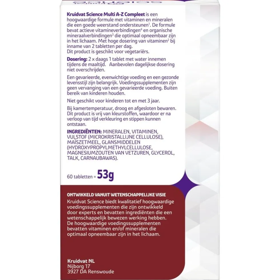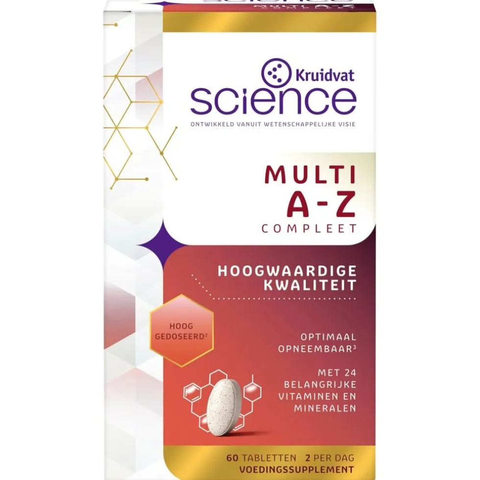Kruidvat Science Multi A-Z Compleet bevat actieve vitamineverbindingen (B5, B6, B12 en foliumzuur) en organische mineraalverbindingen (calcium, chroom, ijzer, selenium, zink). Een actieve vitamineverbinding komt als zodanig ook in je lichaam voor. Je lichaam hoeft deze verbinding niet eerst te bewerken voordat het deze kan benutten. Dat maakt de vitaminen optimaal opneembaar. De organisch gebonden mineralen komen als zodanig in de levende natuur voor.