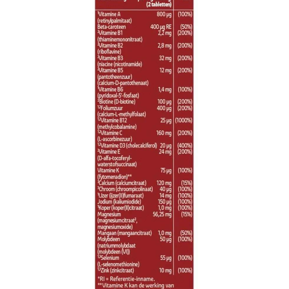 Ingrediënten: mineralen, vitaminen, vulstof (microkristallijne cellulose), maïszetmeel, glansmiddelen (hydroxypropylmethylcellulose, magnesiumzouten van vetzuren, glycerol, talk, carnaubaswas).