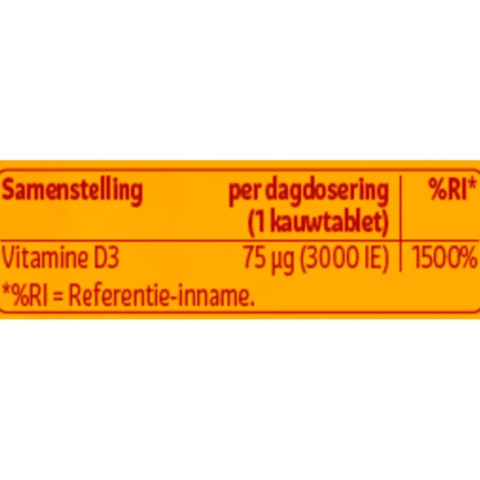 Kruidvat Vitamine D3 75ug Kauwtabletten bevatten een hoge dosering en hebben een fruitsmaak.