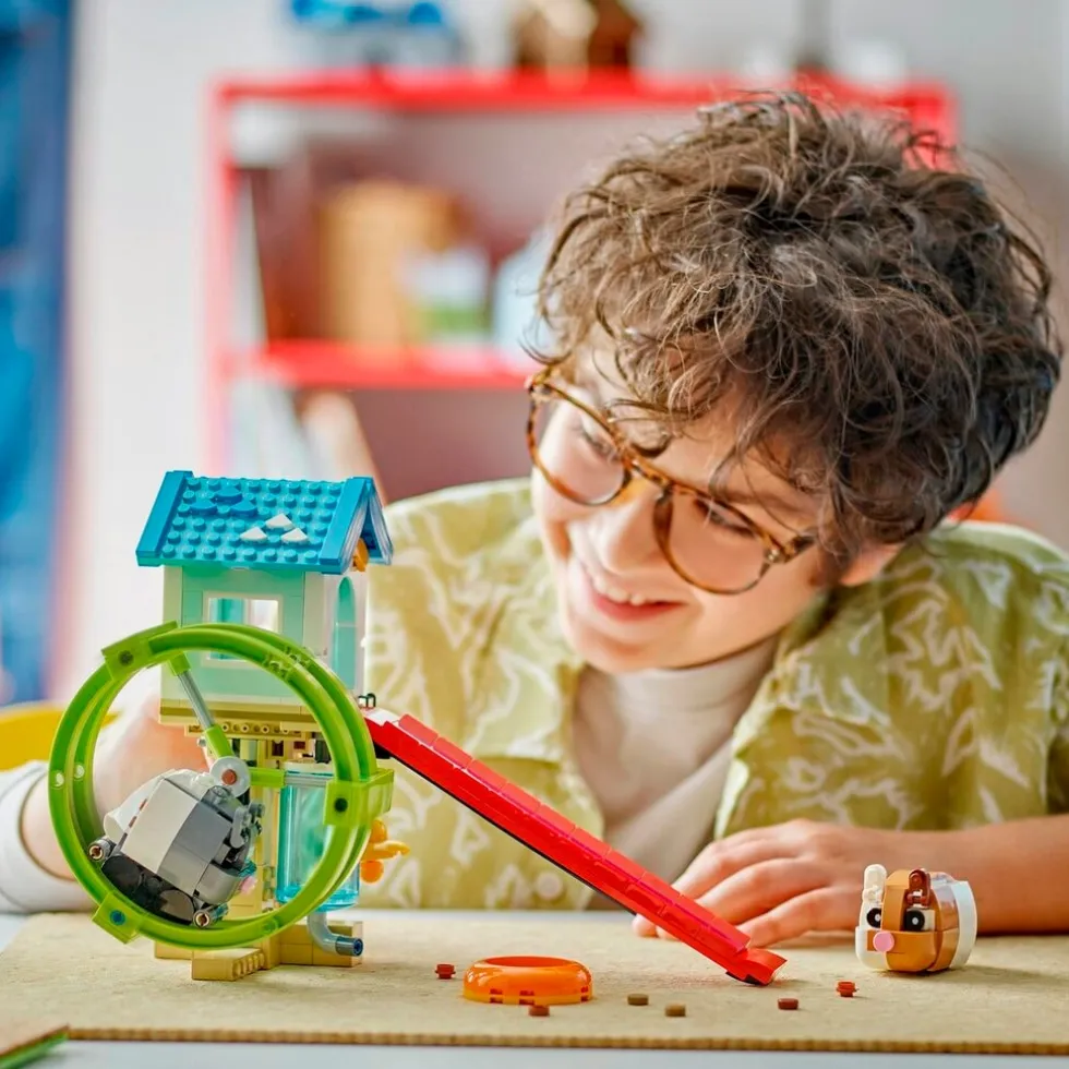 Speel leuke verhalen na met deze schattige 3-in-1 LEGO Creator 31155 Hamsterwiel dierenspeelset. Er is een interactief speelhuis waar een hamster in een draaiend wiel rent en de andere van de glijbaan glijdt.