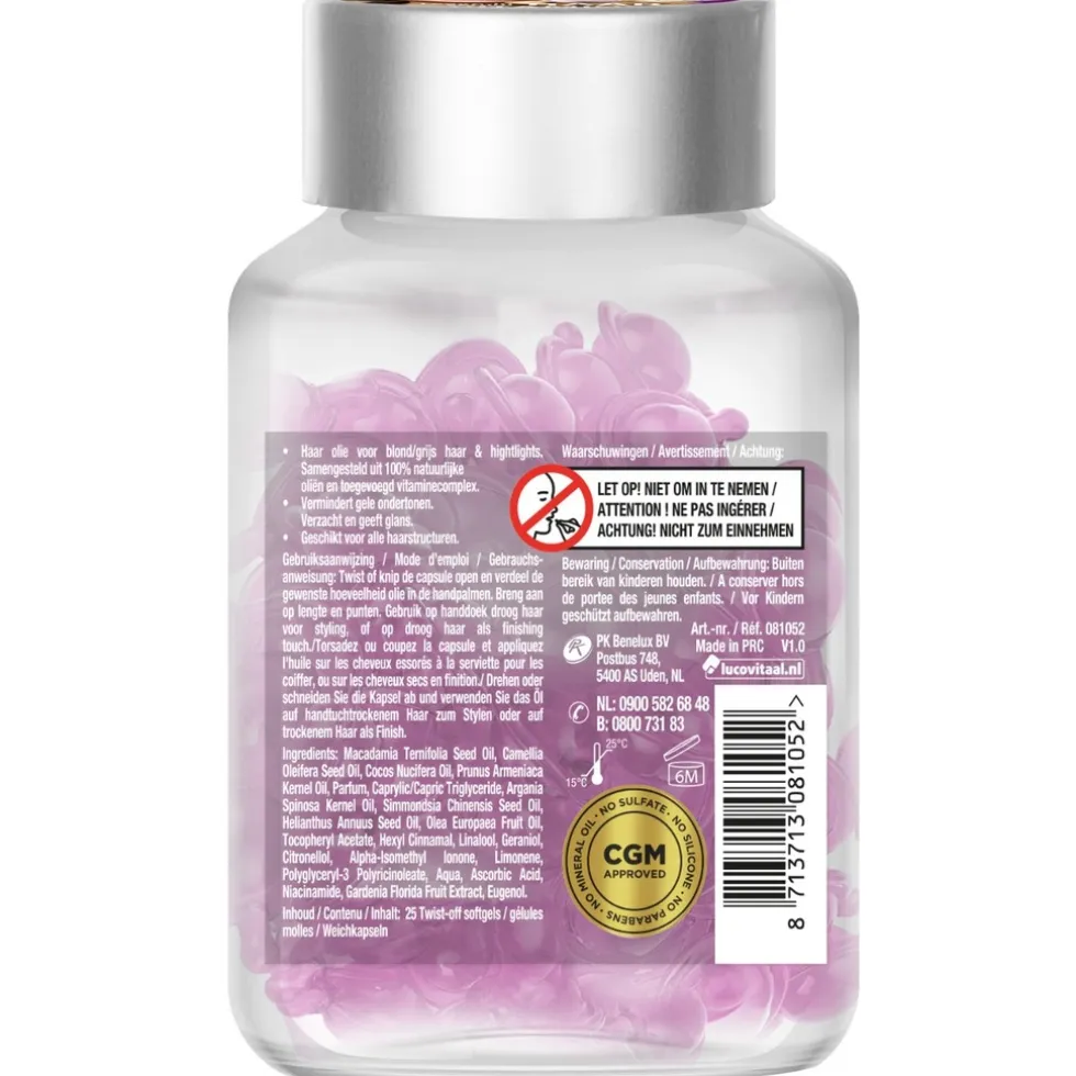Twist of knip de capsule open en verdeel de gewenste hoeveelheid olie in de handpalmen. Breng aan op lengte en punten. Gebruik op handdoek droog haar voor styling, of op droog haar als finishing touch.