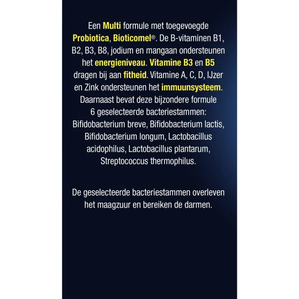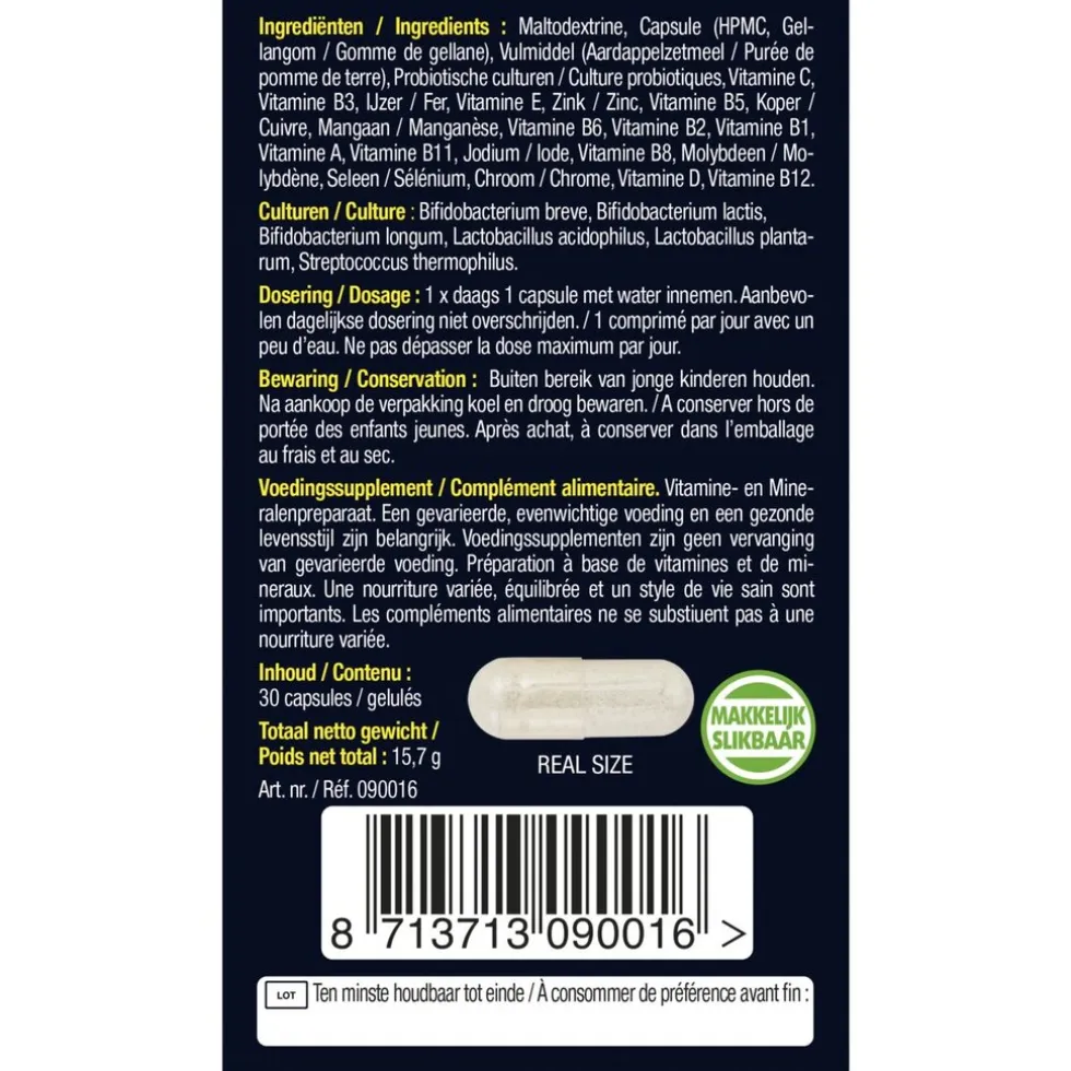 Ingrediënten: Maltodextrine, Capsule (HPMC, Gellangom), Vulmiddel (Aardappelzetmeel), Probiotische culturen, Vitamine C, Vitamine B3, IJzer, Vitamine E, Zink, Vitamine B5, Koper, Mangaan, Vitamine B6, Vitamine B2, Vitamine B1, Vitamine A, Vitamine B11, Jodium, Vitamine B8, Molybdeen, Seleen, Chroom, Vitamine D, Vitamine B12.