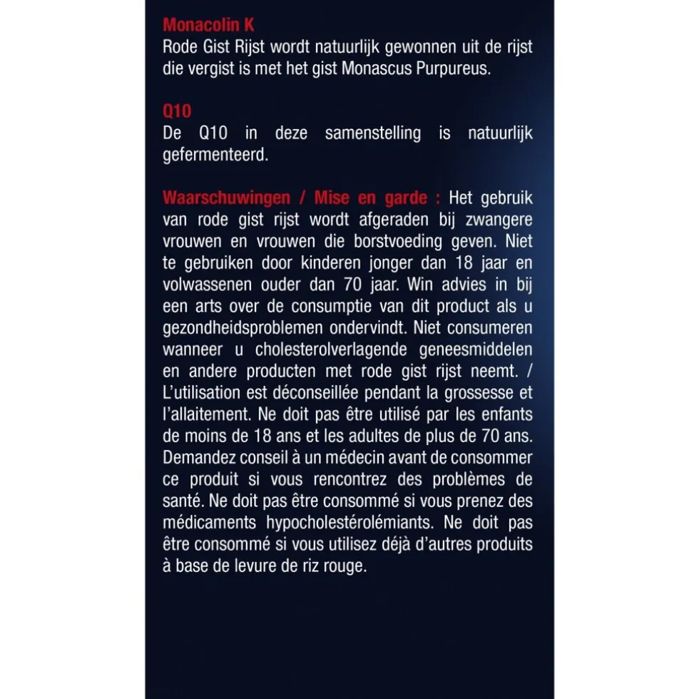 Ingrediënten: Vulmiddelen (Microkristallijne cellulose), Calciumcarbonaat, Rode gist rijst (Monascus Purpureus), Co-Enzym Q10, Antiklontermiddelen (Colloïdale siliciumdioxide, Magnesiumzouten uit vetzuren), Coating (Hydroxypropylmethylcellulose).