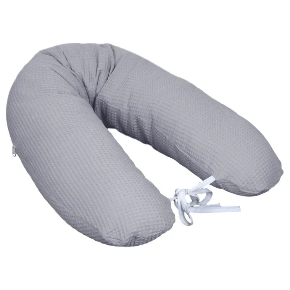 Het voedingskussen is voorzien van een afritsbare hoes die in de wasmachine op 40° gewassen kan worden. Om er voor te zorgen dat het voedingskussen rond blijft staan als je kleintje er op zit of tijdens het voeden, zitten er 2 touwtjes aan het einde van het voedingskussen die aan elkaar geknoopt kunnen worden. De lengte van het voedingskussen is 155 cm.
