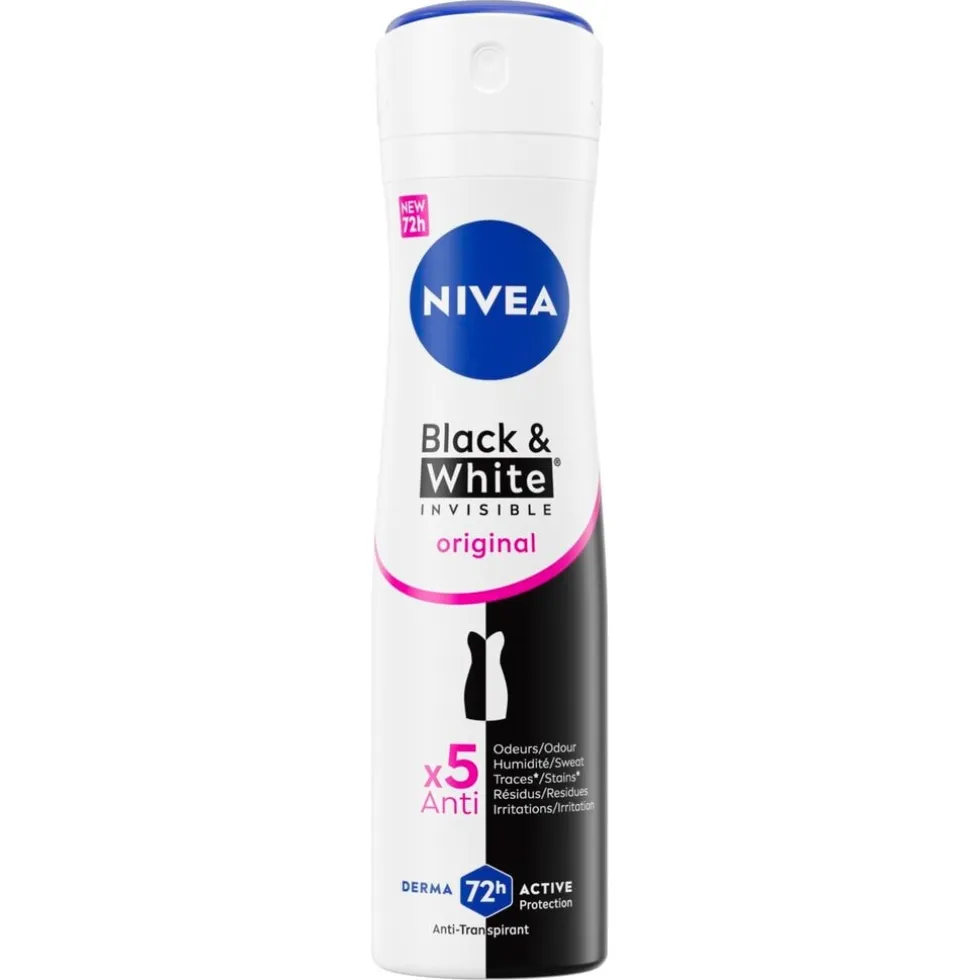 Je witte kleding blijft wit en je zwarte kleding zwart dankzij de NIVEA Black & White Invisible Original Antitranspirant Spray. De deodorant beschermt je oksels 72 uur lang tegen transpiratie en lichaamsgeur.
