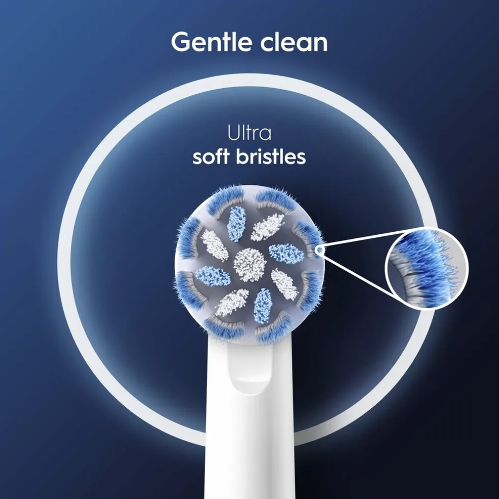 De Oral-B Pro Sensitive Clean Opzetborstels zijn voorzien van gewone borstelharen die tandplak grondig aanpakken, gecombineerd met extra zachte borstelharen die mild zijn voor het tandvlees.
