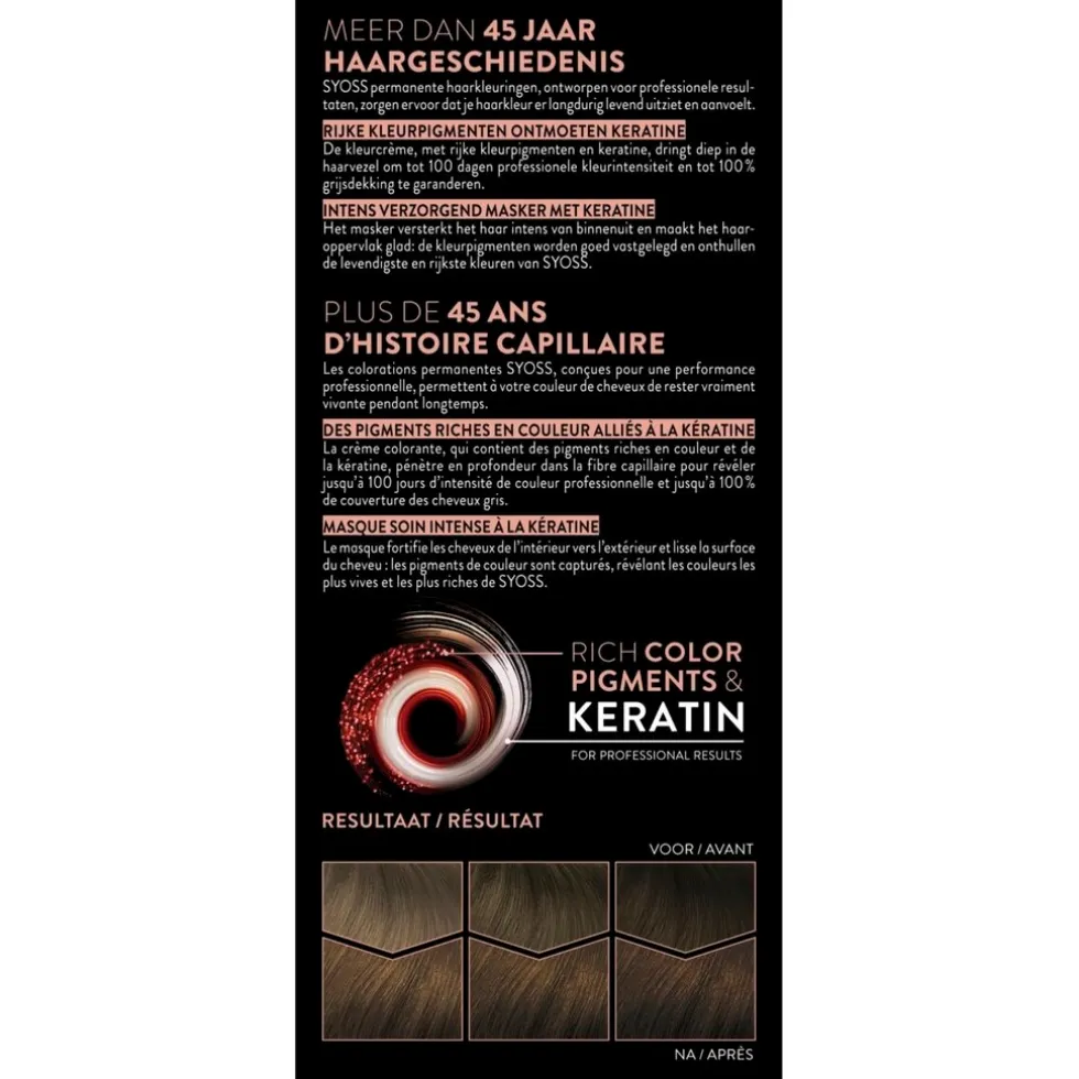 Hoe gebruikt u de Syoss haarkleuring? Bereid het mengsel voor zoals aangegeven is in de gebruiksaanwijzing en breng het aan op droog ongewassen haar. Laat het mengsel inwerken en spoel het daarna grondig uit. De inwerktijd is afhankelijk van de gekozen nuance, raadpleeg de gebruiksaanwijzing. Was je haar met een milde shampoo, breng het haarmasker aan en laat 2 minuten inwerken. Grondig uitspoelen. BELANGRIJK: Lees nauwkeurig voor gebruik de veiligheidsaanbevelingen van de gebruiksaanwijzing door. Voer altijd een allergie waarschuwingstest uit.