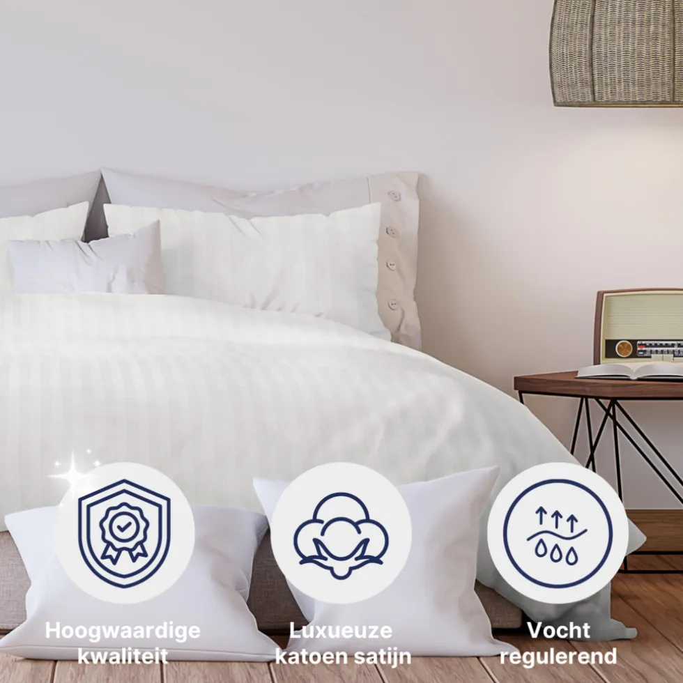 Katoen satijn is een ademende stof met een vocht absorberende eigenschap, dit zorgt voor de perfecte nachtrust.