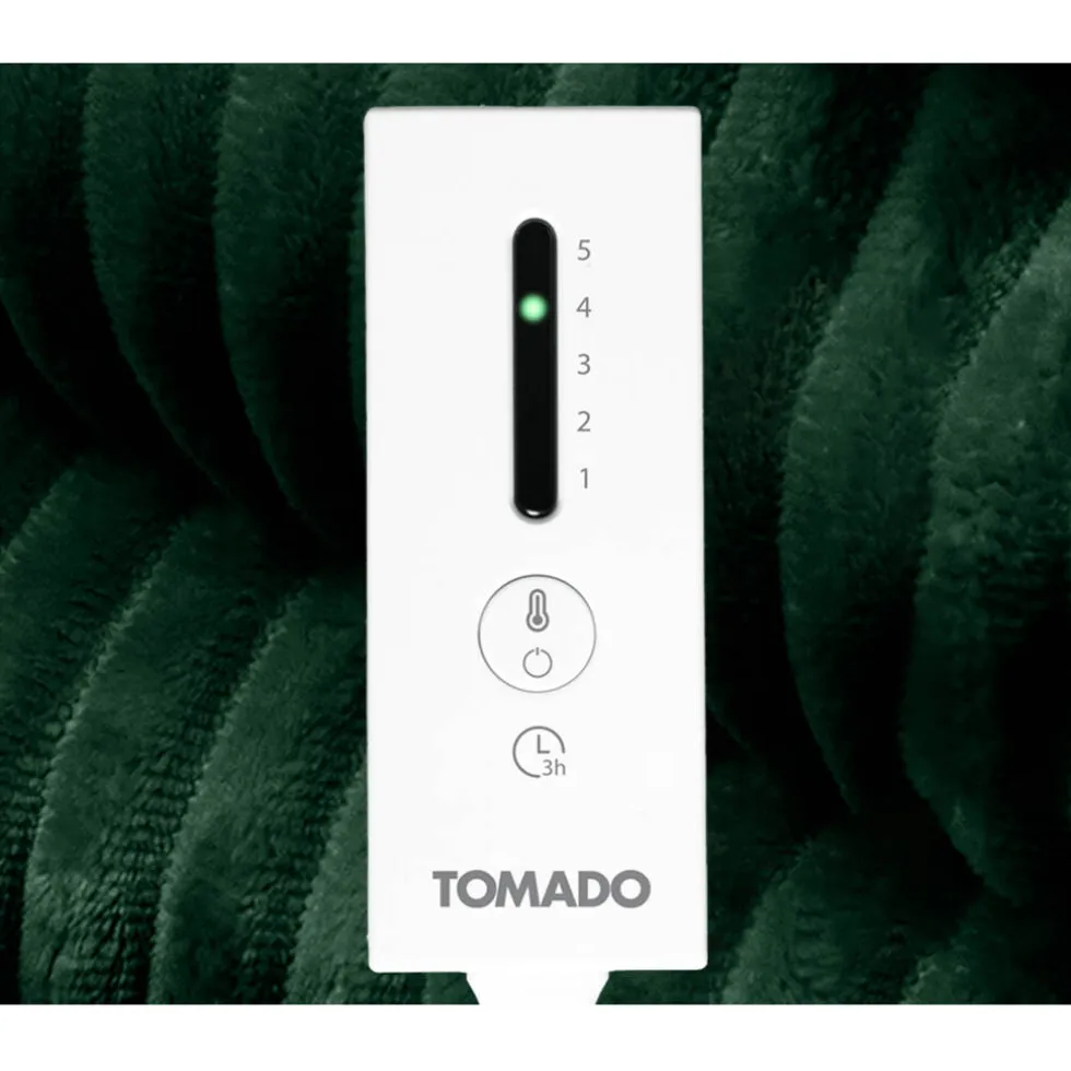 Geniet van ultiem comfort met de Tomado elektrische bovendeken TEB1804G. Deze groene omslagdeken heeft een heerlijk zachte fleece-wollige binnenkant die direct warmte en gezelligheid biedt. Met de verlichte schakelaar stel je moeiteloos een van de 5 warmtestanden in, ook wanneer het donker is. De warmtedeken warmt extra snel op en beschikt over een instelbare automatische uitschakeling tot 180 minuten. Dankzij de ingebouwde oververhittingsbeveiliging gebruik je hem altijd met een gerust hart. Het afneembare snoer maakt het mogelijk de deken in de wasmachine te wassen op maximaal 30°C. Wikkel hem om je heen of leg hem over je benen en ervaar het comfort.