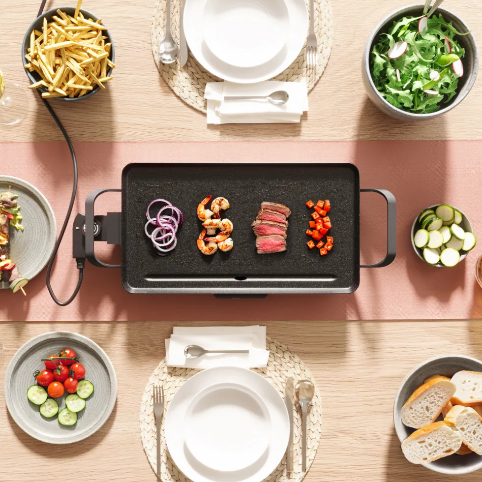 - De Tafel Grill heeft een ruim bakoppervlak van 46 x 26 cm en een verstelbare thermostaat