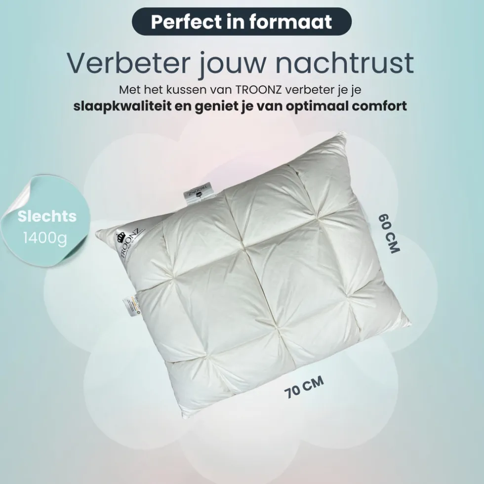 Dit dons gevulde kussen van Troonz biedt ultiem ergonomisch comfort, ideaal voor een ontspannen nachtrust.