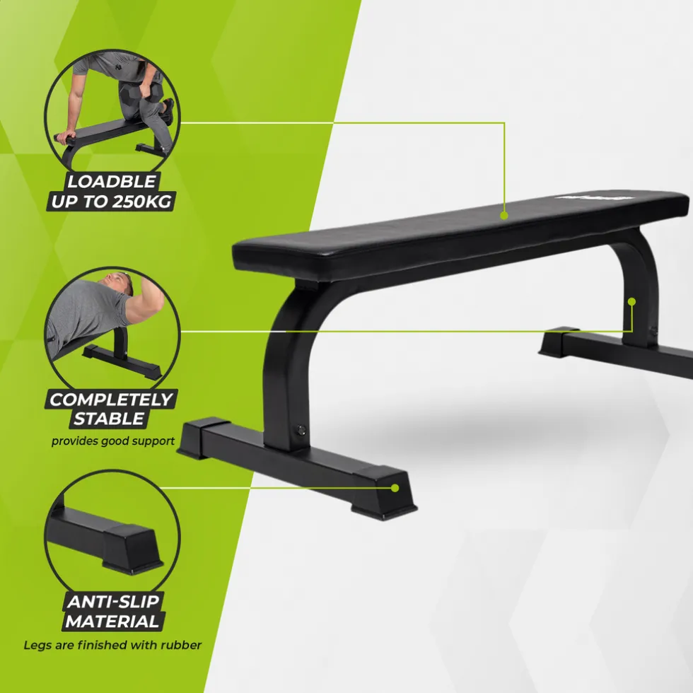 De VirtuFit vlakke trainingsbank is ideaal om te bankdrukken met zware gewichten. Gebruik dumbbells als je alleen gebruik maakt van de bank of gebruik een halter wanneer ook een spotter of haltersteunen gebruikt. Daarnaast kun je ook isolatie oefeningen doen voor bijvoorbeeld je biceps, triceps of zittende shoulder press oefeningen. Zo kun je naast dumbbells en een halter ook een barbell of kettlebell gebruiken. De VirtuFit vlakke trainingsbank helpt je om al deze oefeningen veilig en comfortabel uit te voeren.