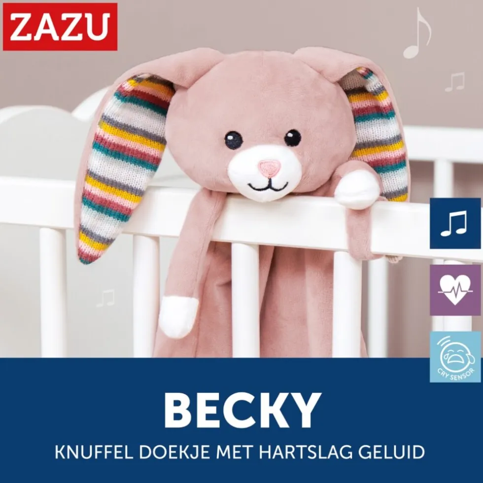 Becky speelt 6 verschillende geluiden af met de keuze uit een hartslag, natuurgeluid, white noise en 3 fijne slaapmelodietjes. Na 10 minuten schakelt de muziek automatisch uit. Als je kleine huilt, zorgt de huilsensor ervoor dat het laatst gekozen nummer weer wordt afgespeeld. Het knuffeldoekje komt met een module waarmee je de geluiden kunt kiezen en het geluidsvolume kunt regelen. De module kun je na het gekozen geluid in het hoofdje van het doekje plaatsen.