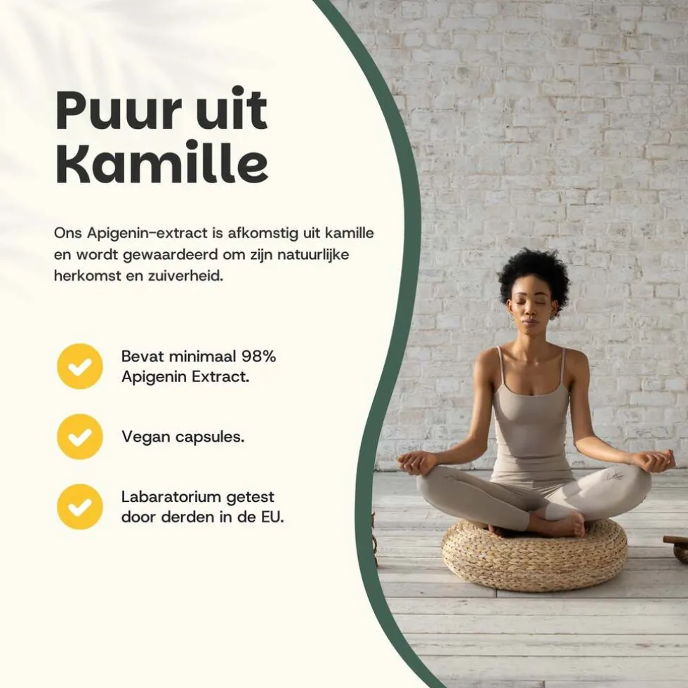 Apigenin (apigenine) is een natuurlijk bioflavonoïde dat van nature voorkomt in onder andere kamille (Matricaria chamomilla). Deze plantaardige verbinding staat bekend om zijn zuivere oorsprong en veelzijdige werking 🌼 100 mg hoogwaardig Apigenin✔️extract per capsule – puur en krachtig 🌿 Natuurlijk gewonnen uit kamille, zonder onnodige toevoegingen 💊 In plantaardige capsules – volledig geschikt voor veganisten ✨ Populaire keuze binnen natuurlijke supplementen vanwege de brede inzetbaarheid