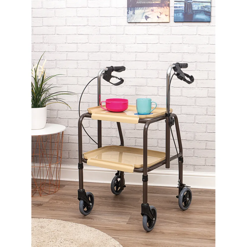 Deze serveerwagen is voorzien van 2 dienbladen en handvatten zoals bij een rollator zodat de gebruiker binnenshuis zeer gemakkelijk spullen / maaltijden kan vervoeren. De dienbladen zijn voorzien van een opstaande rand zodat de spullen die er op staan er niet zomaar af vallen. De dienbladen worden op de serveerwagen geklikt. Net zoals bij een gewone rollator heeft deze serveerwagen handremmen om de veiligheid te vergroten. De hoogte is in te stellen zodat u gemakkelijk achter de serveer rollator kunt lopen ongeacht uw lengte. De serveer rollator is voorzien van massieve wielen die dus niet lek kunnen gaan.