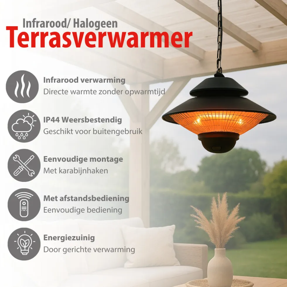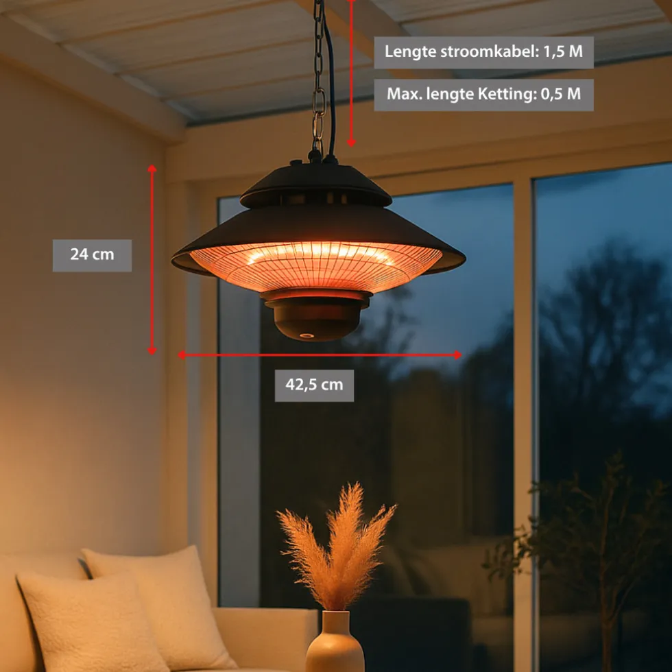 Terrasverwarmer hangend aan het plafondBij de terrasverwarmer zit een montageset die bestaat uit een ketting met een lengte van circa 55 centimeter en 2 karabijnhaken, waarmee je de lamp aan de ketting klikt. Op basis van het vastklikpunt kun je de hoogte van de lamp enigszins laten variëren. Zo’n hangende heater is handig, want hij neemt geen vloerruimte in. De verwarmer heeft een doorsnee van zo’n 42,5 centimeter en een hoogte van ongeveer 25 centimeter.Beschermd tegen vochtDe heater heeft een IP44-bescherming, wat wil zeggen dat dat hij spatwaterdicht is. Hij kan daarmee ruim voldoende tegen vocht en is geschikt voor buiten op overdekte plekken, bijvoorbeeld onder een overkapping. De heater is ook beveiligd tegen oververhitting.Specificaties alpina Terrasverwarmer Hangend met Afstandsbediening 1500W