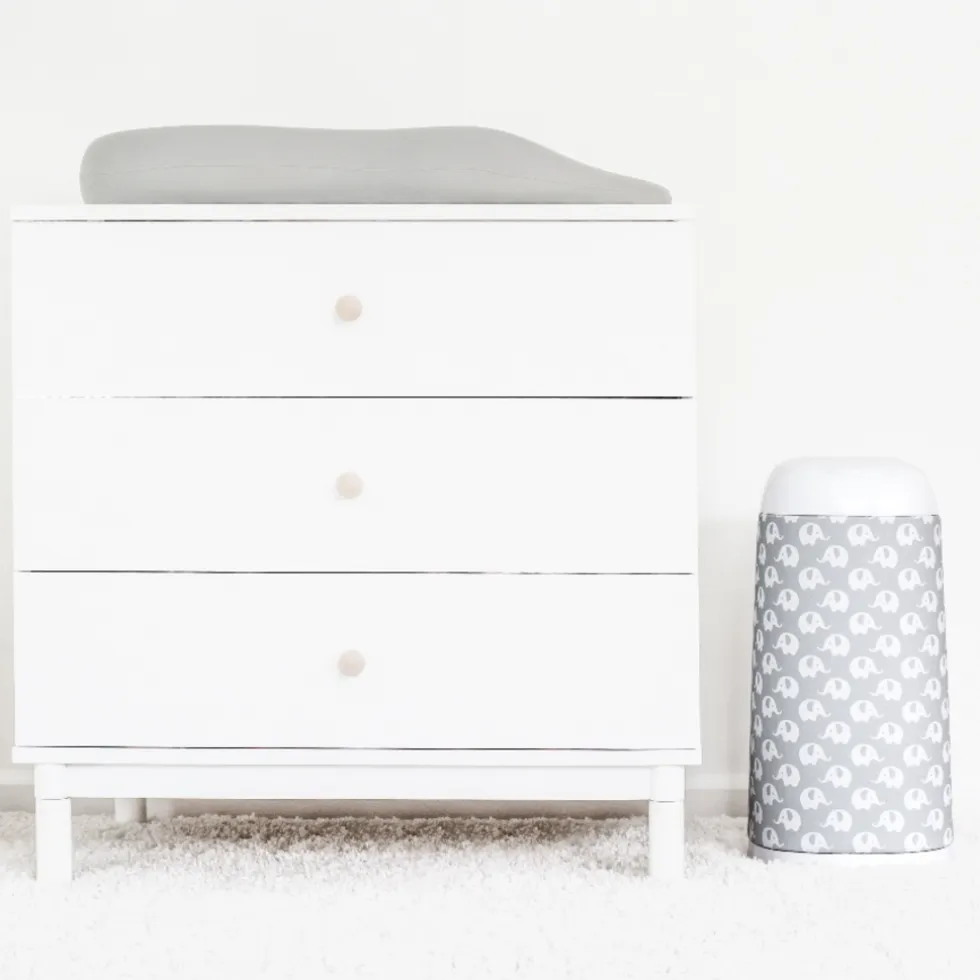 Een stijlvolle manier om de kinderkamer schoon te houden is de Dress Up luieremmer met hippe hoes van Angelcare!