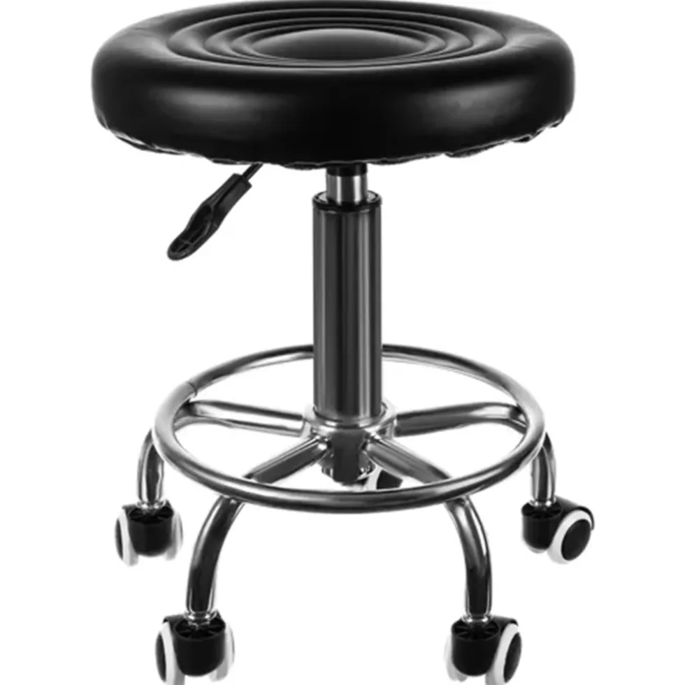 Deze kapperskruk heeft een extra wiel om je benen te ondersteunen voor een ontspannen houding.