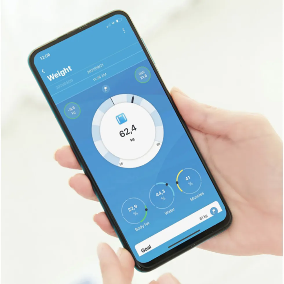 - Gradatie: 0,1% voor vetpercentage, vochtpercentage en spiermassa & 100 gram voor lichaamsgewicht en botmassa