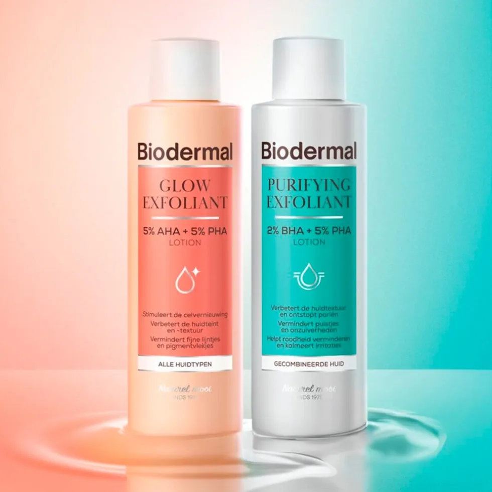 De Biodermal Glow Exfoliant 5% AHA + 5% PHA Lotion is een milde, effectieve exfoliërende lotion die je huidteint en -textuur verbetert zonder daarbij de huidbarrière te beschadigen.