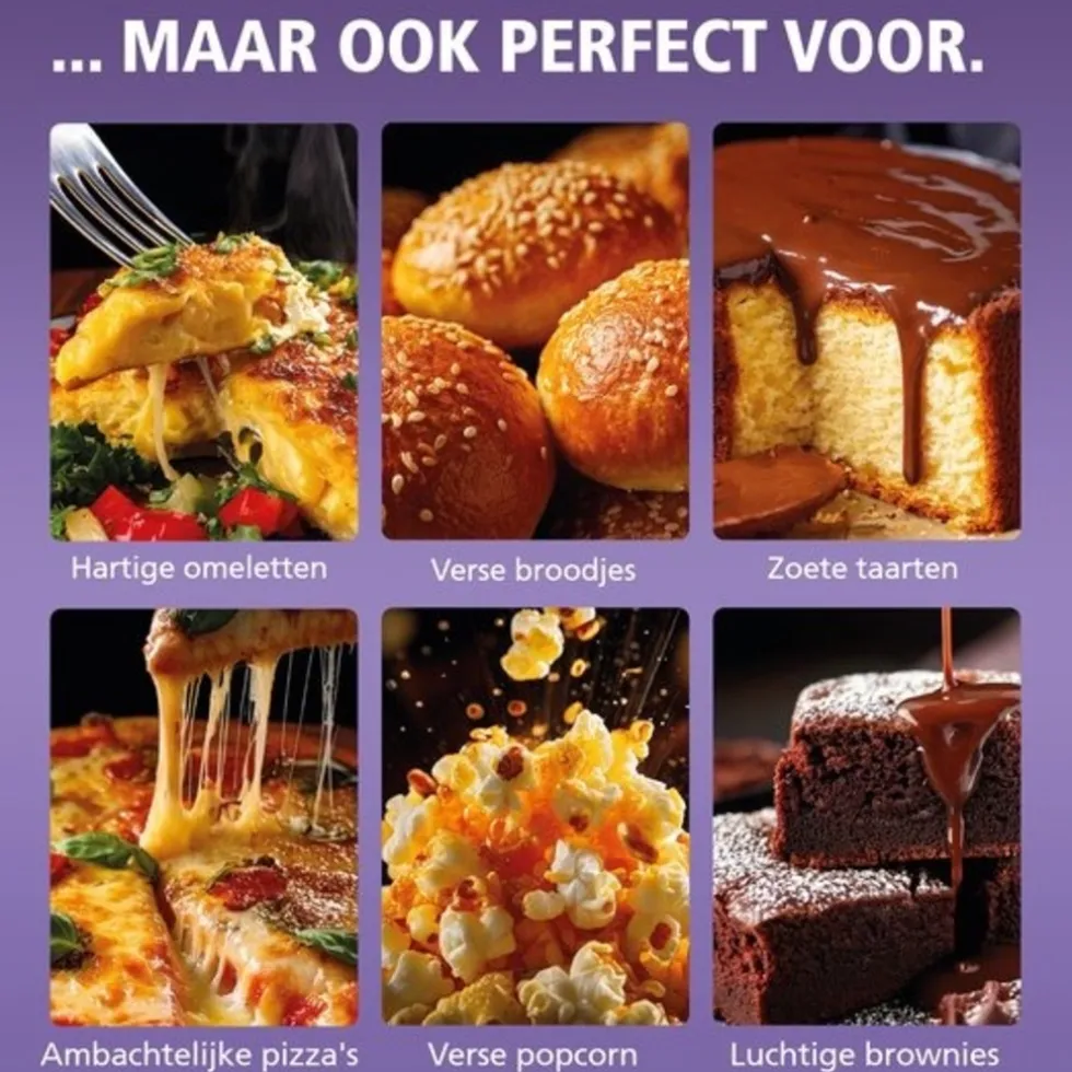 Gezond en efficiënt koken met circulerende hete lucht voor krokante buitenkant en zachte binnenkant, met tot 80% minder vet dan bij traditioneel frituren.